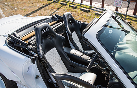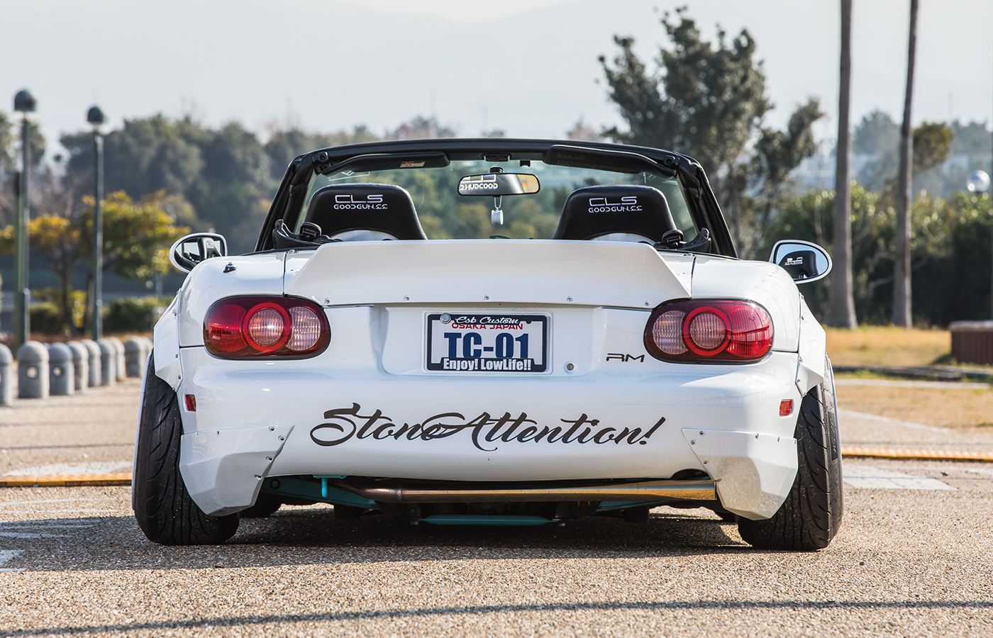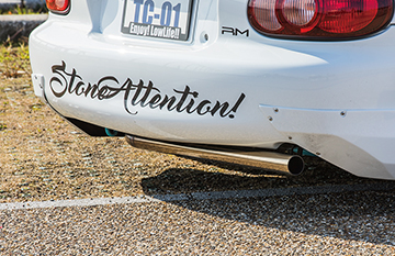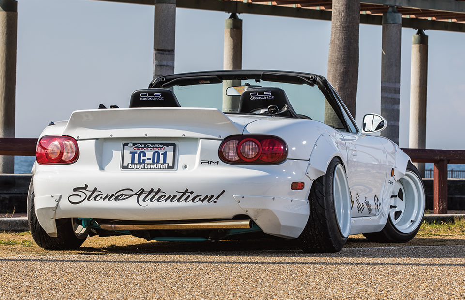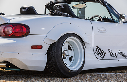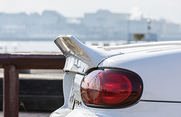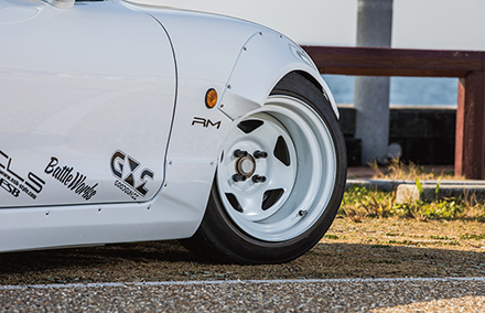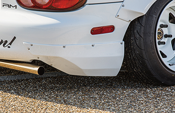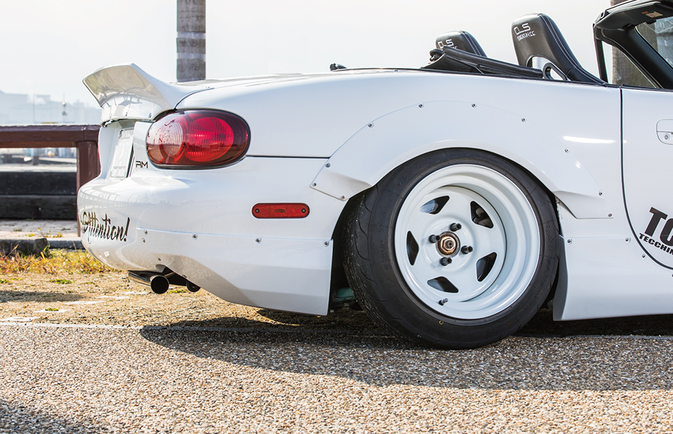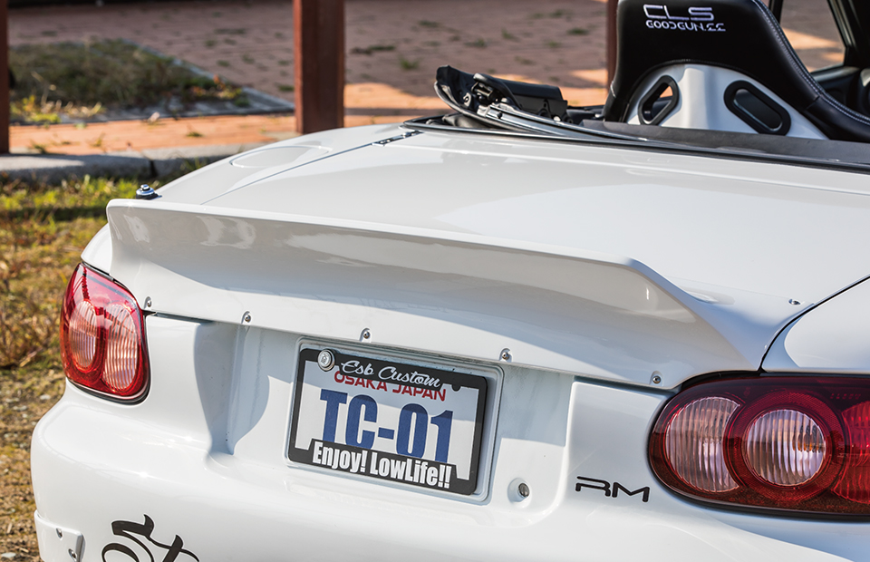 ダックテールタイプのスパルタンなビス留めリアウイング。跳ね上げの角度と、車幅を広く見せるデザインにこだわりました。
