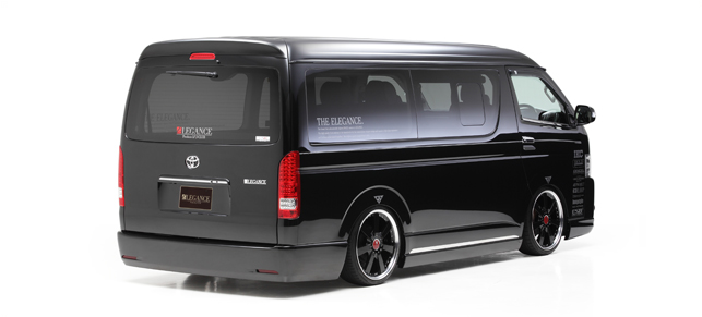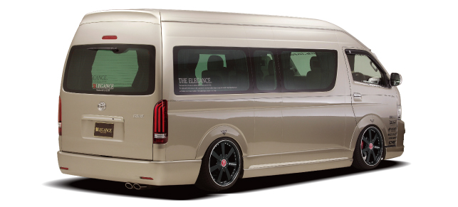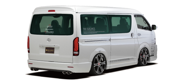 リアビュー、サイドビューから見て もほのかな弧を描くハイルーフ用ルーフスポイラー ※製品の価格は1〜8型と同額となります。 |