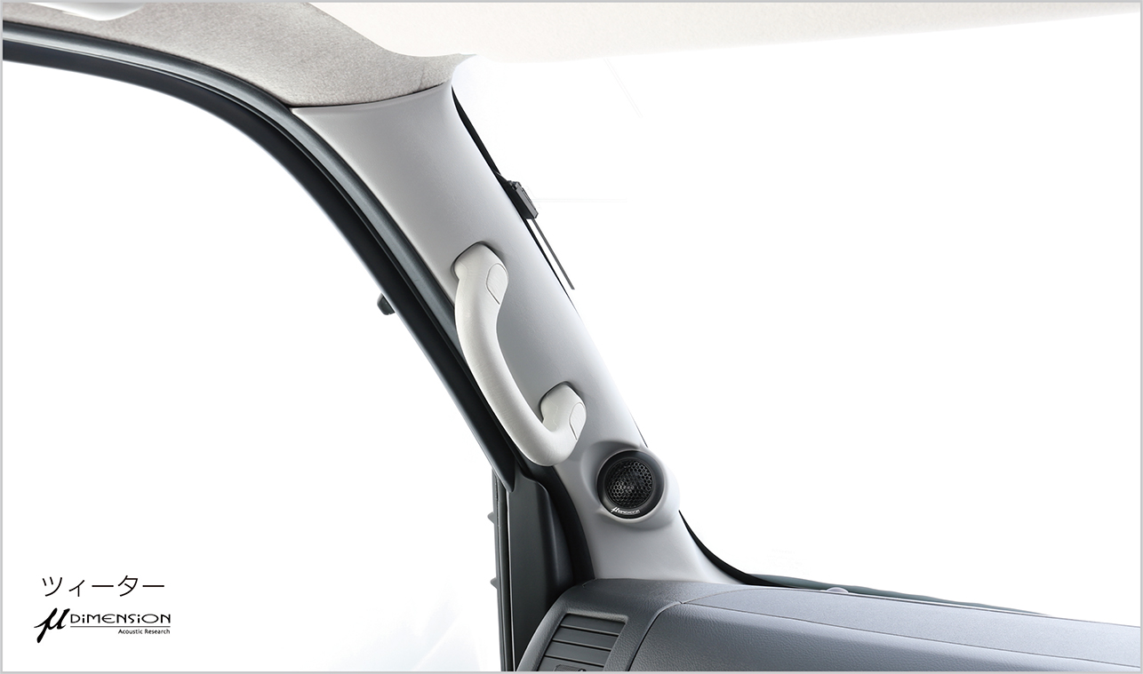 Aピラーフロントスピーカーフルセットは「ツィーター+Aピラー」が一体化した製品に、音響効果をグレードアップする為のオプションパーツが多数付属。効果的にスピーカー背面の音を拡散、 吸収する素材『ディフュージョン』や極めて高い振動吸収性を誇る『レアルシルト』も付属。さらにインナーバッフル、スピーカー端子変換カプラー、取付ビス、ナットも完備。 ハイエースのデッドニングには欠かせないフルセットとなっています。