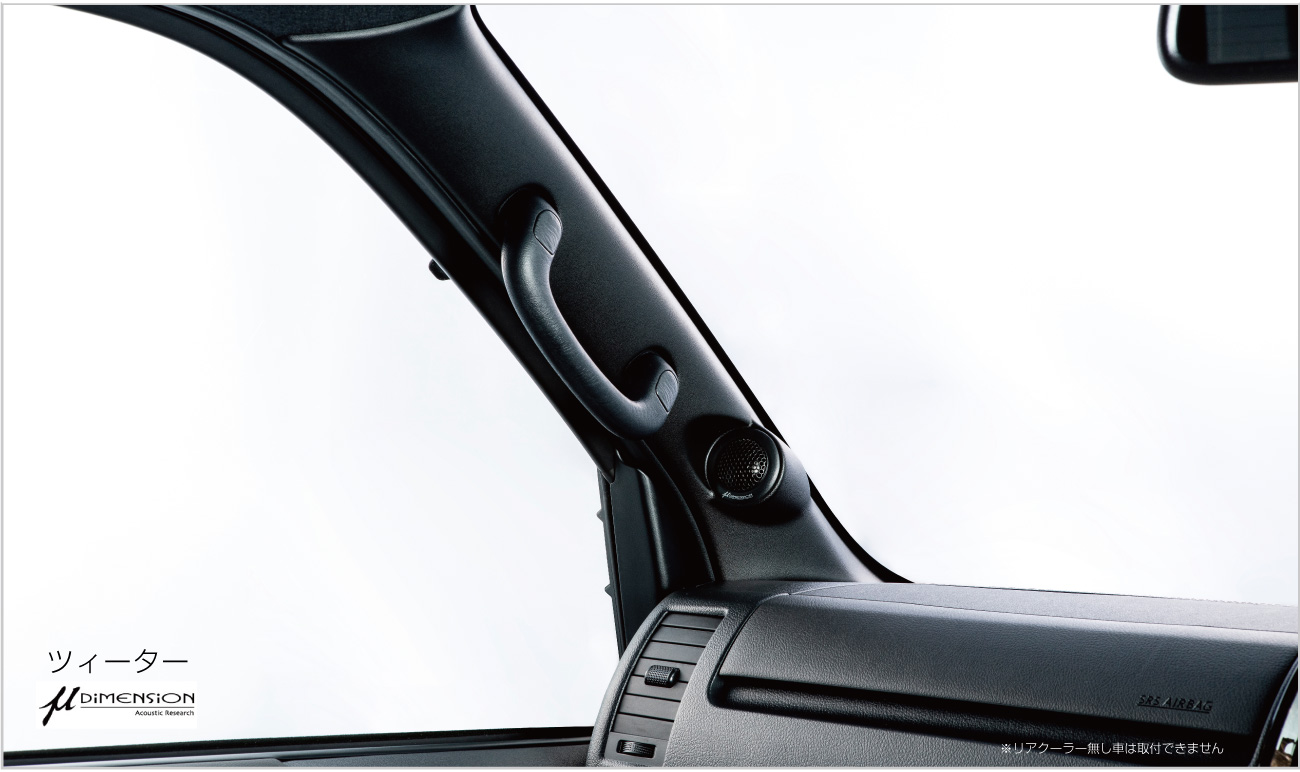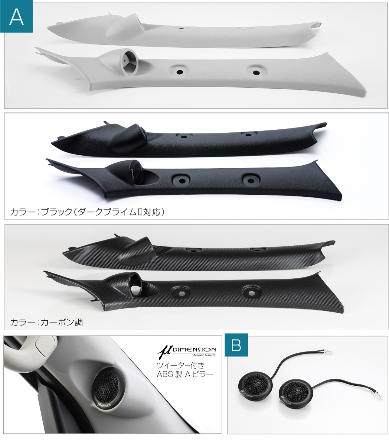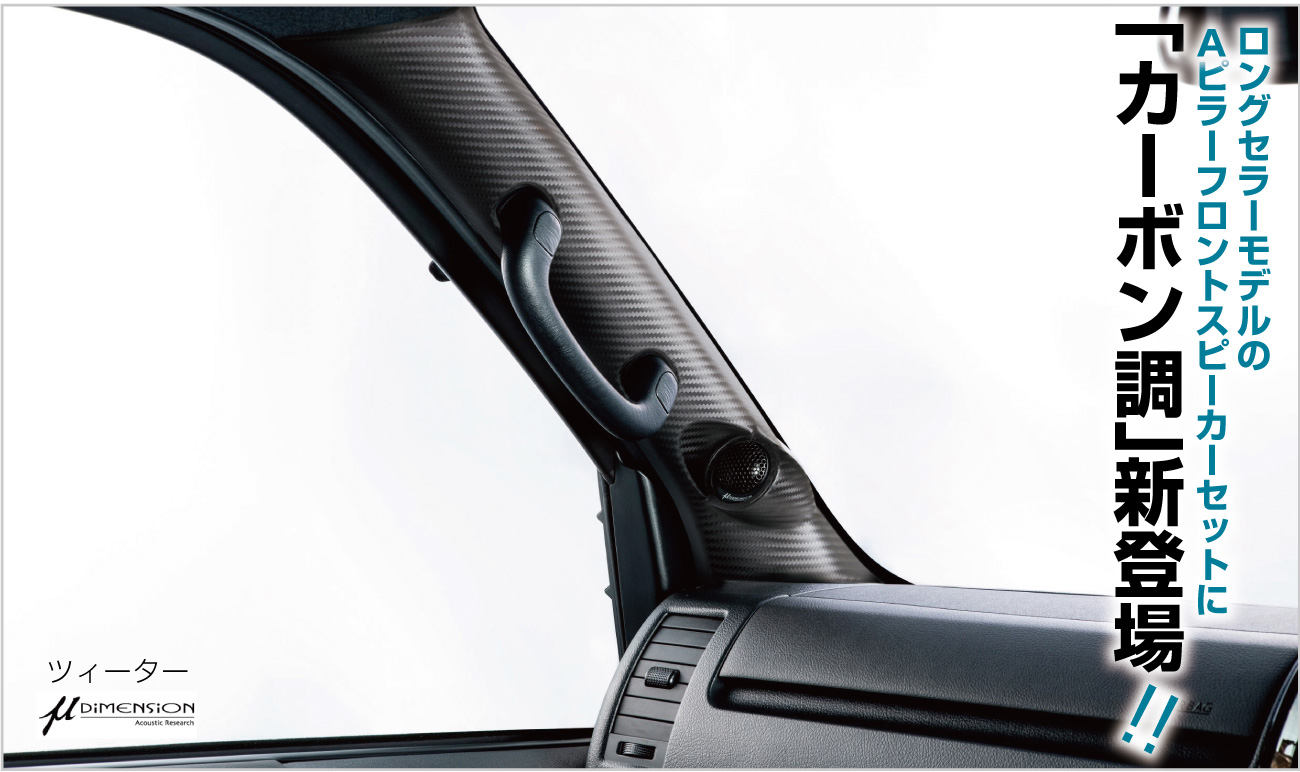 200系ハイエース専用のツィーター付き、ABS樹脂Aピラーに新色として「カーボン調」が追加されました(2022年7月。※カーボン調は耐候性にも優れたAES樹脂を採用)。グレーとブラックは、純正の「シボ」に限りなく近付けた材質のABS樹脂を採用。カーボン調はカスタムユーザーにおすすめです。