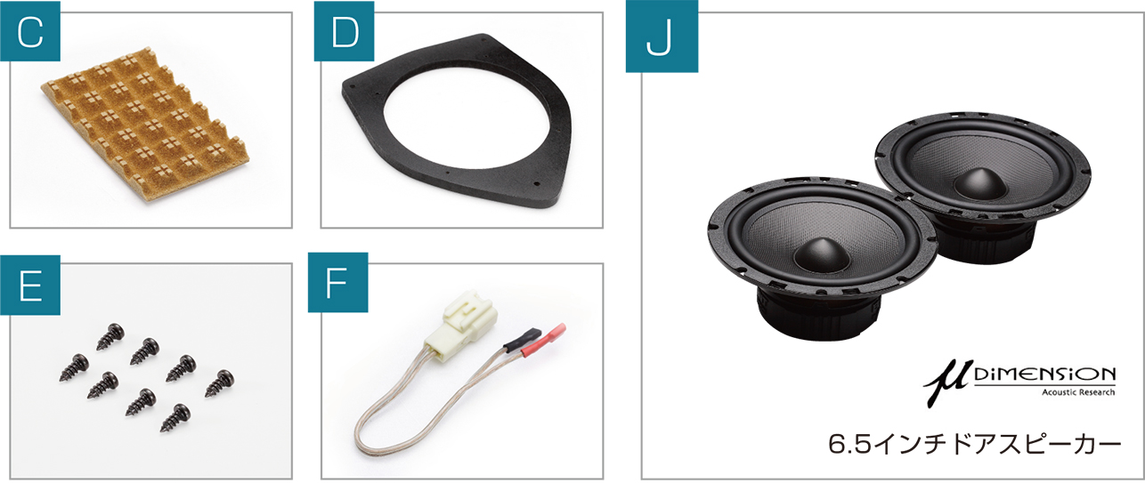 Aピラースピーカーセットに加え、ドアスピーカー+インナーバッフル等を追加したセットもご用意。効果的にスピーカー背面の音を拡散、吸収する素材『ディフュージョン』や極めて高い振動吸収性を誇る『レアルシルト』も付属。さらにインナーバッフル、スピーカー端子変換カプラー、取付ビス、ナットも完備。